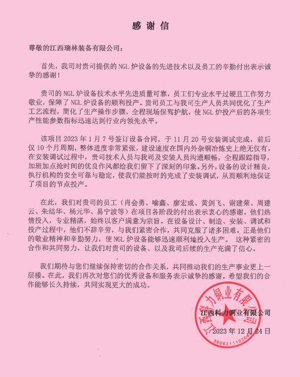 在項(xiàng)目建設(shè)過程中,中國瑞林充分發(fā)揮人才、技術(shù)和管理優(yōu)勢,僅用10個(gè)月時(shí)間,推進(jìn)項(xiàng)目順利進(jìn)入試生產(chǎn)階段,并一舉投產(chǎn)成功,爐時(shí)、能耗等性能指標(biāo)位于行業(yè)內(nèi)領(lǐng)先水平,得到業(yè)主的充分的肯定和誠摯的感謝。業(yè)主表示期待未來繼續(xù)與中國瑞林合作,促進(jìn)雙方高質(zhì)量發(fā)展。
